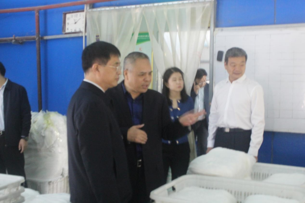 馬冰一行在盧福堂的陪同下參觀了公司制綿5車間、延展車間。盧福堂就民興生物目前的生產(chǎn)經(jīng)營狀況、產(chǎn)品產(chǎn)能情況、絲膠蛋白的研發(fā)進(jìn)展、企業(yè)的進(jìn)出口業(yè)務(wù)、轉(zhuǎn)板上市進(jìn)程及公司的主題教育開展情況向領(lǐng)導(dǎo)一行做了詳細(xì)匯報(bào)。馬冰對(duì)絲膠蛋白的發(fā)展前景非??春茫赋鲆^續(xù)加大研發(fā)力度,早日實(shí)現(xiàn)量產(chǎn),在民興生物科技創(chuàng)新發(fā)展中成為一個(gè)新的科技創(chuàng)新點(diǎn)、突破點(diǎn)。同時(shí)對(duì)企業(yè)的進(jìn)出口業(yè)務(wù)提出了詳細(xì)的指導(dǎo)性建議。