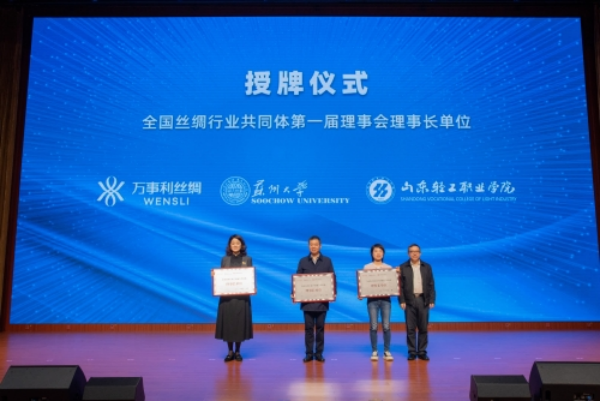 會(huì)上,表決通過了共同體第一屆理事會(huì)理事長(zhǎng)單位、副理事長(zhǎng)單位、理事單位、《全國(guó)絲綢行業(yè)產(chǎn)教融合共同體章程》,發(fā)布需求清單,并為理事長(zhǎng)單位、副理事長(zhǎng)單位代表授牌。