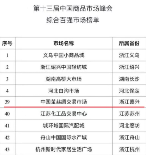 會上,發(fā)布了《中國商品市場綜合百強》榜單,中國繭絲綢交易市場上榜,位列榜單第39位,這也是市場第3次榮獲“中國商品市場綜合百強”榮譽稱號。