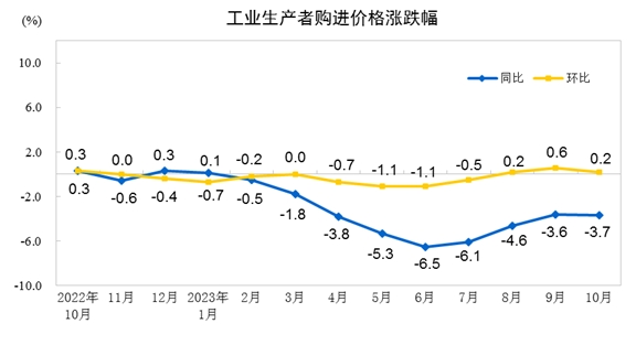 2023年10月份,全國工業(yè)生產(chǎn)者出廠價格同比下降2.6%,環(huán)比持平;工業(yè)生產(chǎn)者購進價格同比下降3.7%,環(huán)比上漲0.2%。1—10月平均,工業(yè)生產(chǎn)者出廠價格比上年同期下降3.1%,工業(yè)生產(chǎn)者購進價格下降3.6%。