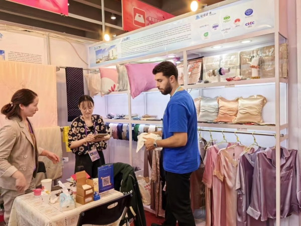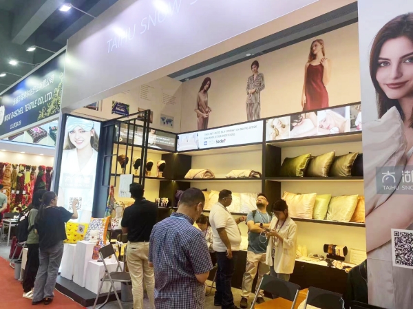 據(jù)曹玲介紹,太湖雪帶去了蠶絲被、真絲套件、真絲眼罩、真絲睡衣等產(chǎn)品?!捌渲?,最受歡迎的是真絲眼罩、發(fā)圈等絲綢飾品,客戶可以通過個性化、時尚化、年輕化的絲綢飾品感受真絲面料的絲滑觸感和奢華體驗?!辈芰岜硎?,2023年以來,太湖雪致力于實施“中國制造+品牌出?!睉?zhàn)略,此次參展將有利于太湖雪進一步提升品牌知名度和國際競爭力,擴大海外客戶朋友圈。