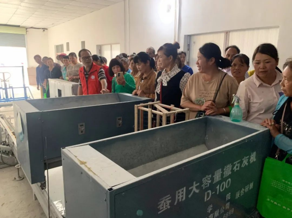 圖為農(nóng)技人員現(xiàn)場(chǎng)講解自動(dòng)化喂蠶設(shè)施