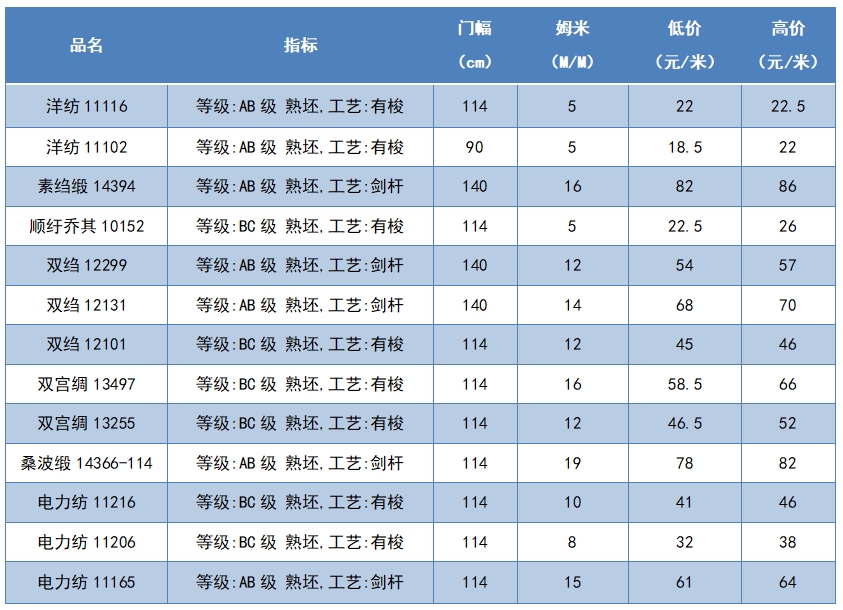 本周綢緞指數(shù)協(xié)作單位成交價格區(qū)間