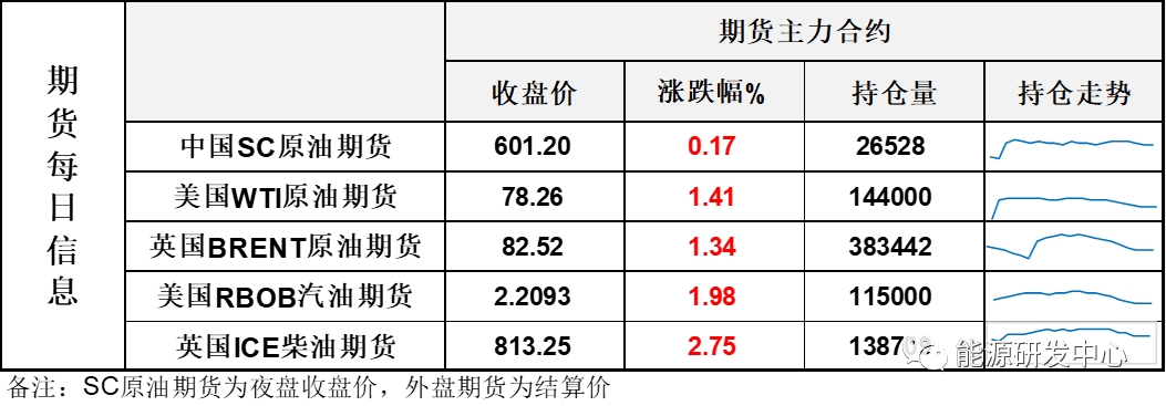 【1】WTI主力原油期貨收漲1.09美元,漲幅1.41%,報78.26美元/桶;布倫特主力原油期貨收漲1.09美元,漲幅1.34%,報82.52美元/桶;INE原油期貨收漲0.17%,報601.2元。