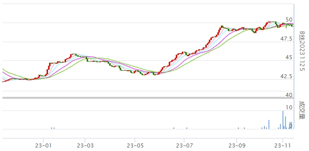 今日(2023年11月14日,周二)中國繭絲綢交易市場(chǎng)生絲指數(shù)微跌0.04%收于4925.75點(diǎn)。B絲(商檢4A級(jí)生絲):231125合約下跌0.03萬元報(bào)收于49.56萬元;240325合約上漲0.03萬元報(bào)收于50.01萬元;240925合約下跌0.06萬元報(bào)收于48.15萬元。