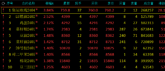 午盤收盤,國內(nèi)期貨主力合約漲多跌少,集運(yùn)指數(shù)(歐線)漲近4%,低硫燃料油(LU)、雞蛋(4307, 50.00, 1.17%)漲超2%,菜粕、豆油、20號膠(NR)、對二甲苯(PX)漲超1%。跌幅方面,純堿跌近5%,玻璃(1684, 13.00, 0.78%)、碳酸鋰跌超3%,焦煤(2046, 54.00, 2.71%)、不銹鋼(SS)、尿素跌超1%。