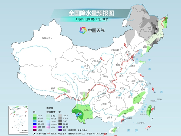 具體來看,中央氣象臺(tái)預(yù)計(jì),今天,內(nèi)蒙古東部、黑龍江、吉林、遼寧北部、西藏東部、川西高原南部等地部分地區(qū)有小到中雪或雨夾雪,其中黑龍江中部、吉林東部等地部分地區(qū)有大雪,局地有暴雪。云南、廣東北部、江西南部和東部、浙江南部、福建北部和西部、海南島、臺(tái)灣島等地部分地區(qū)有小到中雨,其中云南西部局地有大雨。