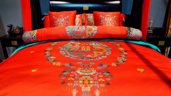 山西潞安府潞綢集團品牌部經(jīng)理劉朵霞介紹:“我們潞安府主打產(chǎn)品是‘新娘潞綢被’,主要有手繡、織錦、印花和提花四大系列。這套潞綢被設計靈感來源于故宮坤寧宮的喜字和龍鳳。在圖案上弘揚傳承了傳統(tǒng)文化,媽媽們特別喜歡。同時,紅配綠這樣的配色,也受到了年輕人的青睞?!?/p>