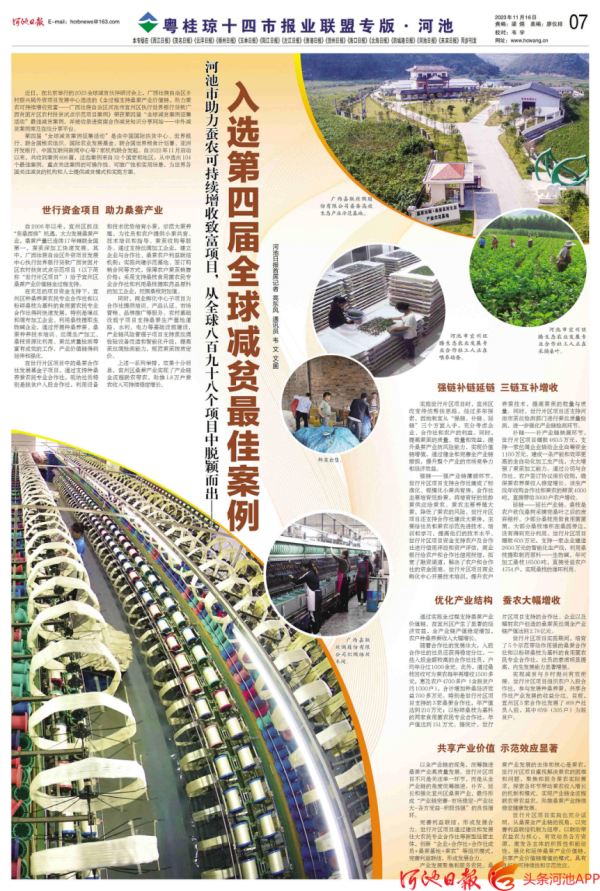 近日,在北京舉行的2023全球減貧伙伴研討會上,廣西壯族自治區(qū)鄉(xiāng)村振興局外資項目發(fā)展中心選送的《全過程支持桑蠶產(chǎn)業(yè)價值鏈,助力蠶農(nóng)可持續(xù)增收致富——廣西壯族自治區(qū)河池市宜州區(qū)執(zhí)行世界銀行貸款廣西貧困片區(qū)農(nóng)村扶貧試點示范項目案例》榮獲第四屆“全球減貧案例征集活動”最佳減貧案例,并被收錄進南南合作減貧知識分享網(wǎng)站——中外減貧案例庫及在線分享平臺。