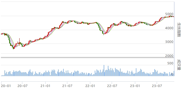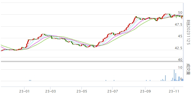 今日(2023年11月17日,周五)中國繭絲綢交易市場(chǎng)生絲指數(shù)上漲0.47%收于4956.19點(diǎn),本周生絲指數(shù)上漲0.16%。B絲(商檢4A級(jí)生絲):231125合約報(bào)平收于49.68萬元;240325合約上漲0.45萬元報(bào)收于50.49萬元;240925合吧約上漲0.42萬元報(bào)收于48.81萬元。今日盤面A絲價(jià)格繼續(xù)上漲。231125生絲合約日線