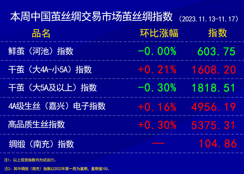 鮮繭指數(shù)上,全國蠶繭上市進(jìn)入尾期,在多數(shù)協(xié)作單位多停止收購鮮繭下,本周所報(bào)筆數(shù)減少,整體鮮繭指數(shù)環(huán)比收平,價(jià)格波動(dòng)不大。