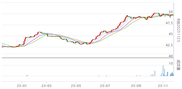 今日(2023年11月22日,周三)中國繭絲綢交易市場生絲指數(shù)下跌0.20%收于4982.98點。B絲(商檢4A級生絲):231125合約下跌0.06萬元報收于49.68萬元;240325合約下跌0.18萬元報收于50.88萬元;240925合約上漲0.03萬元報收于49.14萬元。今日盤面A絲合約價格繼續(xù)上漲。