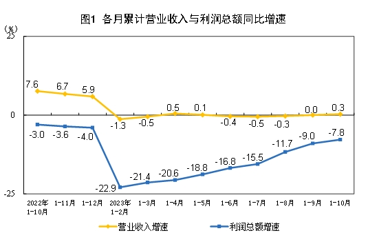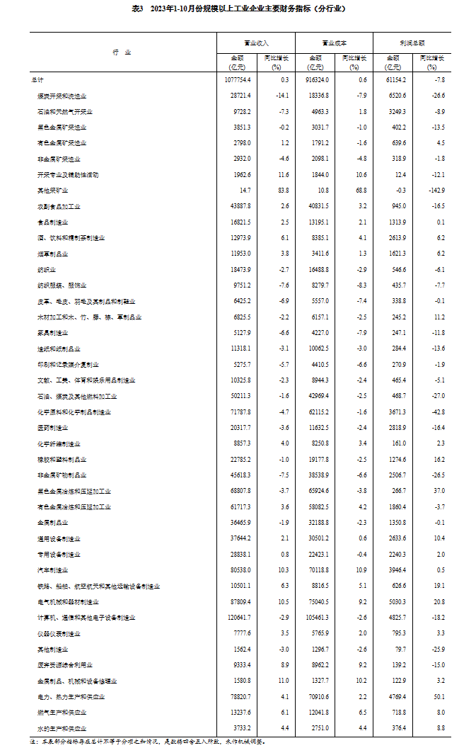 1—10月份,全國(guó)規(guī)模以上工業(yè)企業(yè)實(shí)現(xiàn)利潤(rùn)總額61154.2億元,同比下降7.8%,降幅比1—9月份收窄1.2個(gè)百分點(diǎn)(按可比口徑計(jì)算,詳見附注二)。