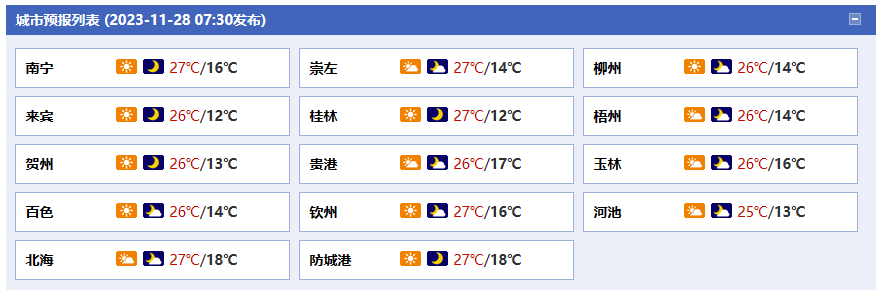 南寧市:今天白天到晚上,晴間多云,東北風(fēng)1~2級(jí),最高氣溫27℃,最低氣溫16℃。