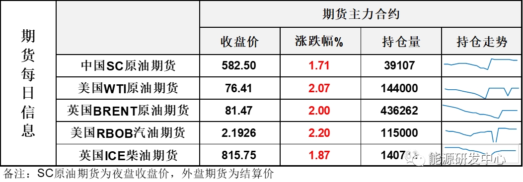 【1】WTI主力原油期貨收漲1.55美元,漲幅2.07%,報(bào)76.41美元/桶;布倫特主力原油期貨收漲1.6美元,漲幅2%,報(bào)81.47美元/桶;INE原油期貨收漲1.71%,報(bào)582.5元。