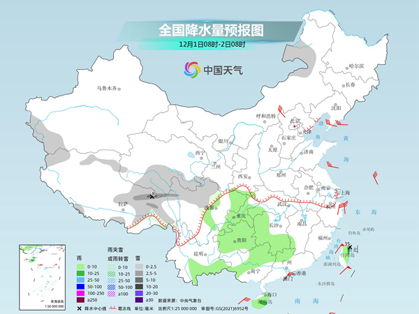具體來(lái)看,今天山東半島、黑龍江東部和中部、新疆南疆西部山區(qū)、西藏北部和東部、青海南部、川西高原北部、陜西南部、湖北西北部等地部分地區(qū)有小到中雪或雨夾雪,其中,山東半島、川西高原北部等地部分地區(qū)有大到暴雪。四川盆地、湖南北部和南部、江西南部、福建中西部、湖北南部、貴州大部、云南東部、廣西、廣東北部、海南島、臺(tái)灣島中北部等地部分地區(qū)有小到中雨,其中,海南島東部、臺(tái)灣島北部局地有大雨。