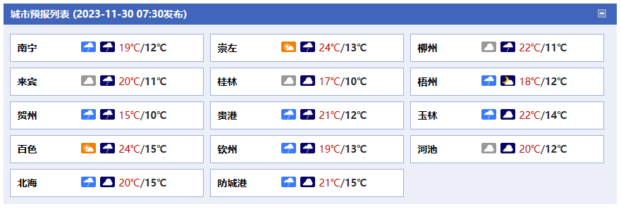 南寧市:今天白天到晚上,陰天有小雨,東北風(fēng)3~4級(jí)、陣風(fēng)5~6級(jí),最高氣溫19℃,最低氣溫12℃。