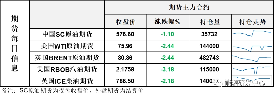 【1】WTI主力原油期貨收跌1.9美元,跌幅2.44%,報75.96美元/桶;布倫特主力原油期貨收跌2.02美元,跌幅2.44%,報80.86美元/桶;INE原油期貨收跌1.1%,報576.6元。