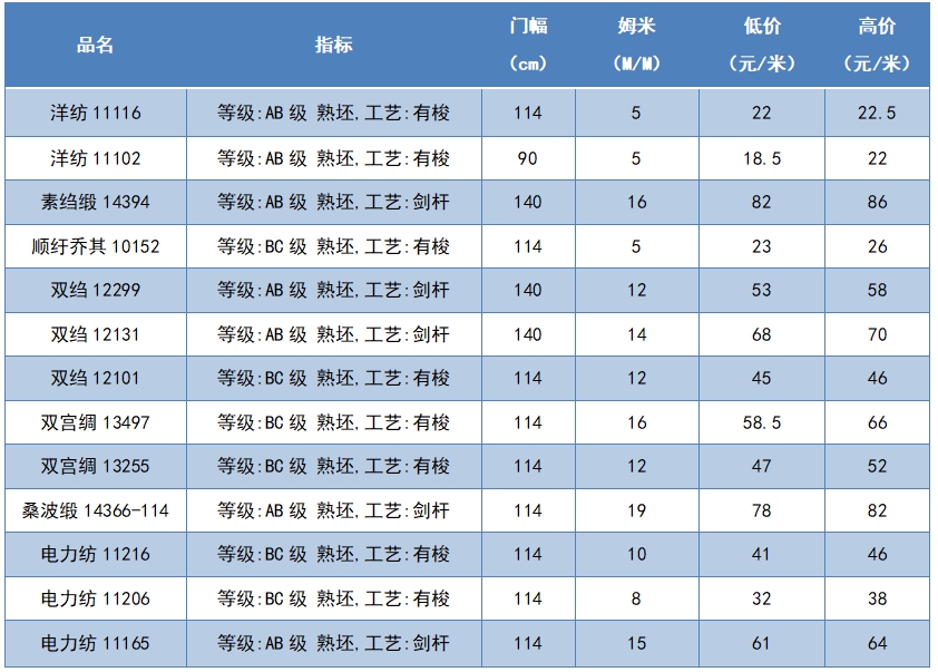 本周綢緞指數(shù)協(xié)作單位成交價(jià)格區(qū)間