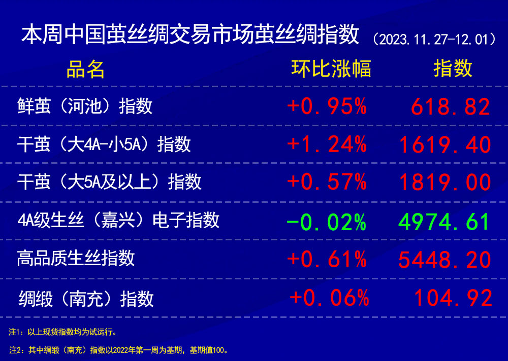 今日(2023年12月01日,周五)中國(guó)繭絲綢交易市場(chǎng)生絲指數(shù)微跌0.01%收于4974.61點(diǎn),本周生絲指數(shù)微跌0.02%。B絲(商檢4A級(jí)生絲):231225合約下跌0.06萬(wàn)元報(bào)收于49.77萬(wàn)元;240325合約上漲0.06萬(wàn)元報(bào)收于50.61萬(wàn)元;240925合約上漲0.06萬(wàn)元報(bào)收于49.17萬(wàn)元。