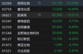 醫(yī)藥外包概念股領(lǐng)跌,藥明生物跌近24%,已暫停交易。消息面上,藥明生物今日在港交所公告,公司股份已于12月4日10時49分在香港聯(lián)合交易所有限公司暫停買賣,以待刊發(fā)可能構(gòu)成公司內(nèi)幕消息的公告。藥明生物今日在盤前召開經(jīng)營交流會,下調(diào)部分業(yè)務(wù)板塊營收預(yù)期,其中預(yù)期2023年,藥物開發(fā)(D)營收下降18%-20%,生產(chǎn)(M)營收下降15%-18%。兩塊收入下降導(dǎo)致全年營收預(yù)期從30%增長下調(diào)到10%左右。