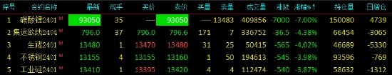 023年12月5日,期市收盤,國內(nèi)期貨主力合約大面積飄綠,碳酸鋰封跌停板,跌幅7%,集運指數(shù)(歐線)、生豬跌超4%,工業(yè)硅、不銹鋼(SS)、滬鎳(129360, 1670.00, 1.31%)跌近4%。漲幅方面,純堿漲超6%,尿素漲超3%。