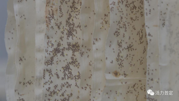 位于普定縣農(nóng)業(yè)園區(qū)的小蠶共育基地里,技術(shù)人員們正在對蠶繭進(jìn)行篩選、削繭、鑒蛹、攤蛹,并把雌雄蠶蛹放置到特定的廠房里。據(jù)介紹,蠶蛹化蛹成蛾后經(jīng)過雌雄蠶蛾的交配產(chǎn)卵,就能得到新的蠶種。另一邊,如芝麻般的蠶卵密密麻麻地分布在蠶紙上,工作人員仔細(xì)地將它們懸掛在架子上,并提供適宜生存的環(huán)境和條件,進(jìn)一步培育優(yōu)質(zhì)蠶種。