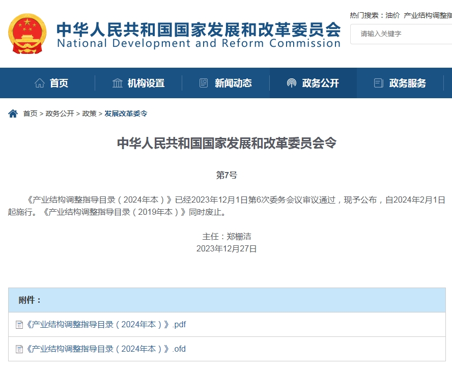 2023年12月27日,國家發(fā)展和改革委員會發(fā)布第7號令:《產(chǎn)業(yè)結(jié)構(gòu)調(diào)整指導(dǎo)目錄(2024年本)》(以下簡稱《目錄(2024 年本)》)已經(jīng)2023年12月1日第6次委務(wù)會議審議通過,現(xiàn)予公布,自2024年2月1日起施行?!懂a(chǎn)業(yè)結(jié)構(gòu)調(diào)整指導(dǎo)目錄(2019年本)》同時廢止。