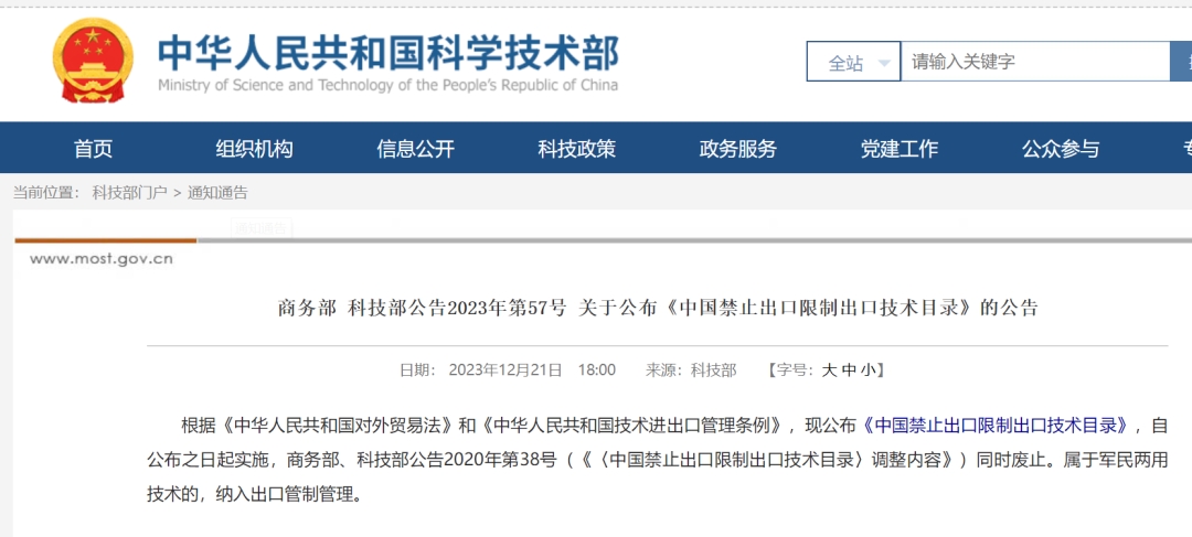 商務(wù)部和科技部公布《中國禁止出口限制出口技術(shù)目錄》
