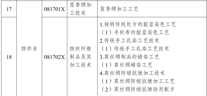 紡織相關(guān)限制出口部分:獨特傳統(tǒng)處方的靛藍染色工藝:手織布的靛藍染色工藝,傳統(tǒng)手工扎染工藝技術(shù),真絲綢制品的蠟染工藝,真絲綢防縮抗皺加工技術(shù):(1)真絲綢防縮抗皺加工工藝(2)真絲綢防縮抗皺助劑配方,古代絲織品復制技術(shù),碳纖維加工技術(shù),用于航天器殼體的纖維增強樹脂基復合材料生產(chǎn)技術(shù)……(詳見附件)