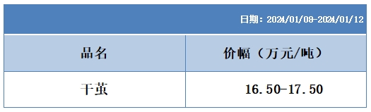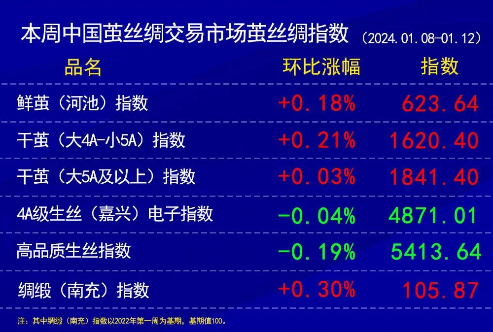 蠶繭指數(shù)上,根據(jù)協(xié)作單位所報(bào)。干繭貿(mào)易量不多,工廠有在春節(jié)前繼續(xù)備原料。本周兩個(gè)等級(jí)的干繭指數(shù)環(huán)比略上漲。