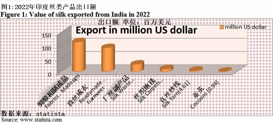 圖 1 為 2022 年印度的各類絲綢產(chǎn)品出口額。2022 年,綢緞和絲綢制成品出口額為1.1241 億美元,占比最大,其后依次是絲綢成衣 9042 萬美元,廠絲副產(chǎn)品2802萬美元,絲織地毯1063萬美元,真絲紗線461萬美元和蠶繭94萬美元。