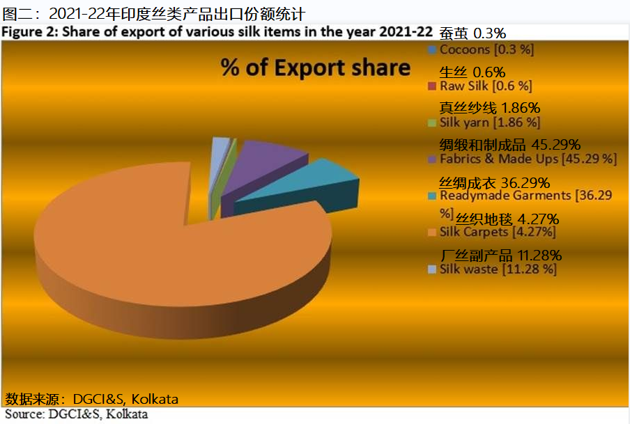 圖2中,在2021-22年度期間,綢緞和絲綢制成品在印度各類絲綢產(chǎn)品出口中占比最大,出口額達(dá)45.29%。成衣和廠絲副產(chǎn)品是絲綢出口的第二和第三大產(chǎn)品,分別占36.29%和11.28%。絲綢地毯、真絲紗線、生絲和蠶繭是這一時(shí)期印度的其他重要出口產(chǎn)品。