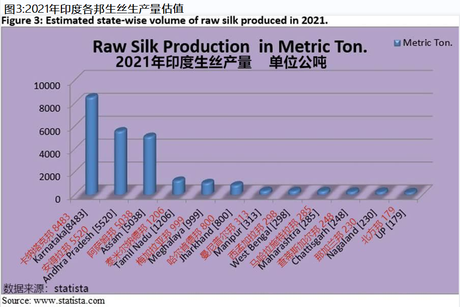 圖3顯示,2021 年印度各邦中,卡納塔克邦的生絲生產(chǎn)量最高,為8486公噸,安得拉邦和阿薩姆邦是第二和第三大生絲生產(chǎn)邦,分別為5520公噸和5038 公噸。泰米爾納德邦和梅加拉亞邦是第四和第五大生絲生產(chǎn)邦。