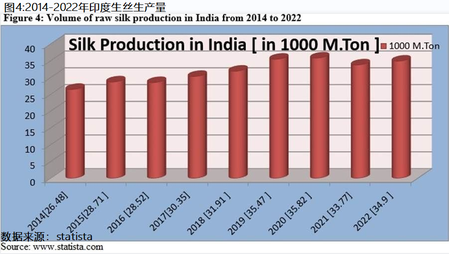 根據(jù)印度相關(guān)資料,印度的生絲總產(chǎn)量從2014年的26480公噸增加到2022年的34900公噸。期間2020年的生絲產(chǎn)量最大,達(dá)到35820公噸。這對(duì)印度產(chǎn)業(yè)來說是一個(gè)好兆頭,因?yàn)樯z產(chǎn)量的上升趨勢增強(qiáng)了絲綢生產(chǎn)的前景,同時(shí)也為該國人民創(chuàng)造了更多就業(yè)機(jī)會(huì)。