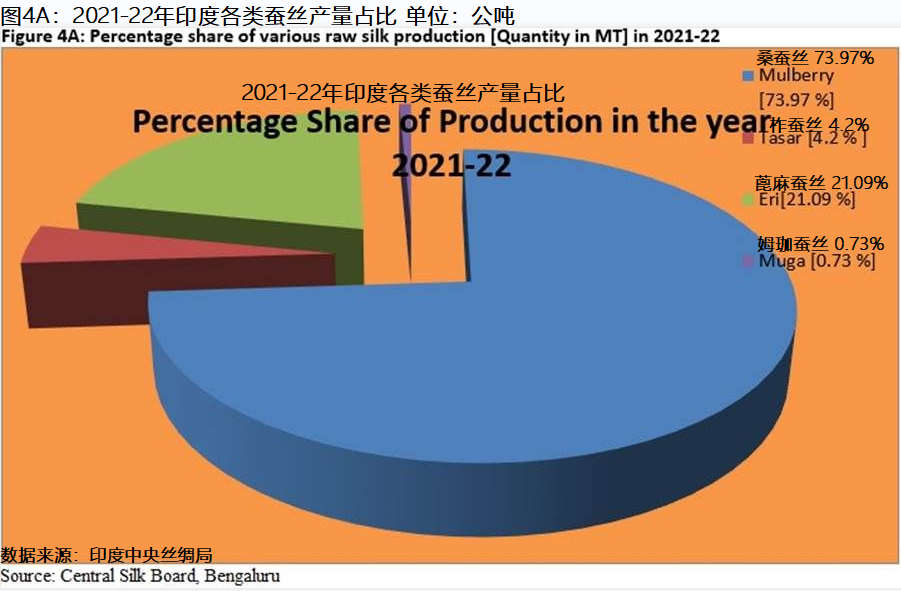 圖 4A 顯示,2021-22 年印度共生產(chǎn)4種蠶絲。桑蠶絲是主要的生產(chǎn)原料,占蠶絲總產(chǎn)量的73.97%。蓖麻蠶絲是第二大蠶絲類型,占21.09%。柞蠶絲和姆珈蠶絲的份額分別為4.2%和0.73%。