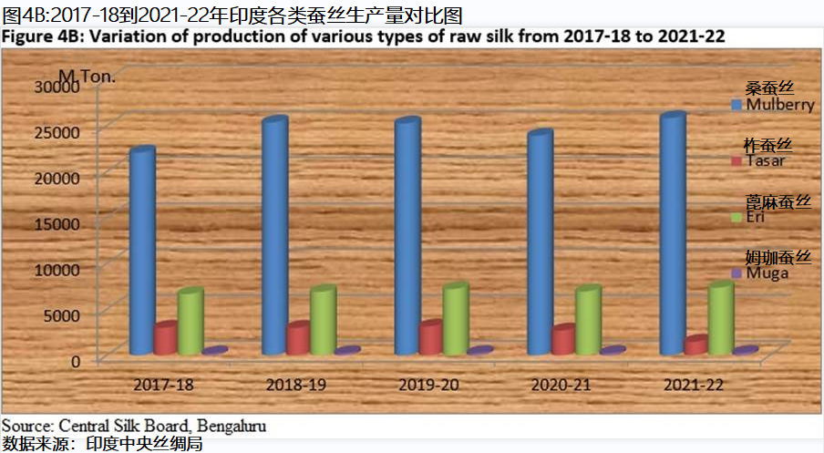 如圖4B顯示,印度桑蠶絲產(chǎn)量最高,2021-22年度產(chǎn)量超過25000公噸。與 2020-21 年相比,2021-22 年的桑蠶絲產(chǎn)量要高得多。蓖麻蠶絲為印度第二大蠶絲品種,產(chǎn)量為5000公噸。與 2020-21 年相比,2021-22 年柞蠶絲產(chǎn)量有所下降。