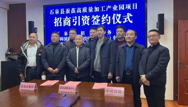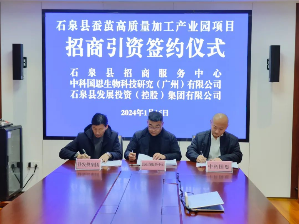 1月16日,陜西省石泉縣蠶繭高質(zhì)量加工產(chǎn)業(yè)園項(xiàng)目招商引資簽約儀式在發(fā)投集團(tuán)順利舉行。石泉縣招商服務(wù)中心、中科國(guó)思生物科技研究(廣州)有限公司、石泉縣發(fā)展投資(控股)集團(tuán)有限公司三方成功簽訂招商引資合作協(xié)議,標(biāo)志著石泉蠶桑產(chǎn)業(yè)步入科技賦能、轉(zhuǎn)型升級(jí)新階段。