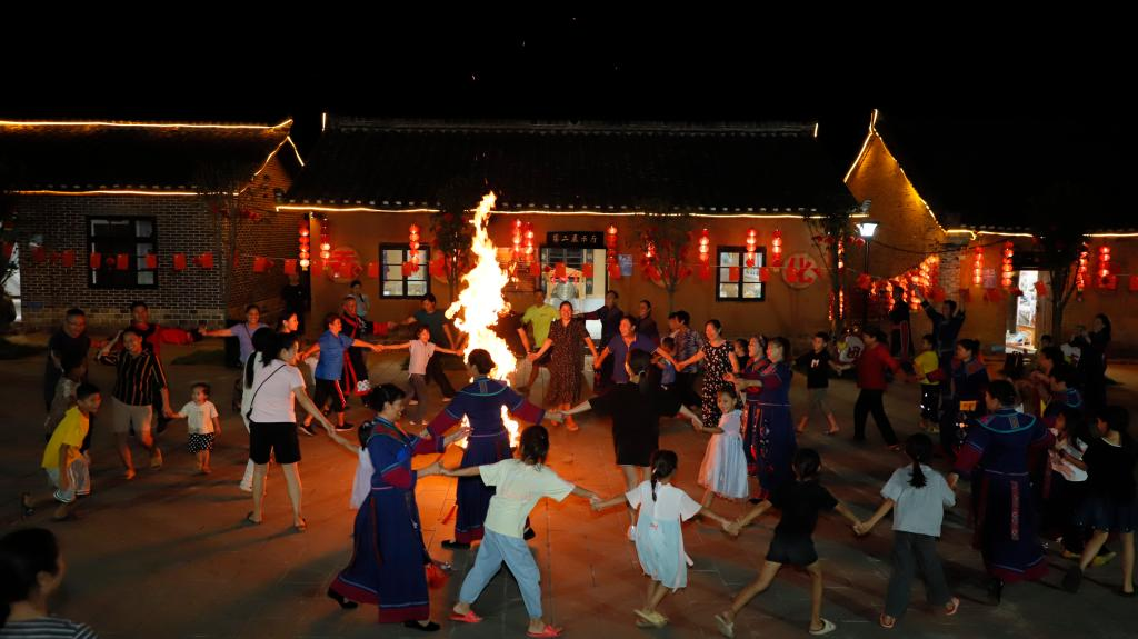 在廣西河池市環(huán)江毛南族自治縣大才鄉(xiāng)新坡村,游客在村里參與篝火晚會