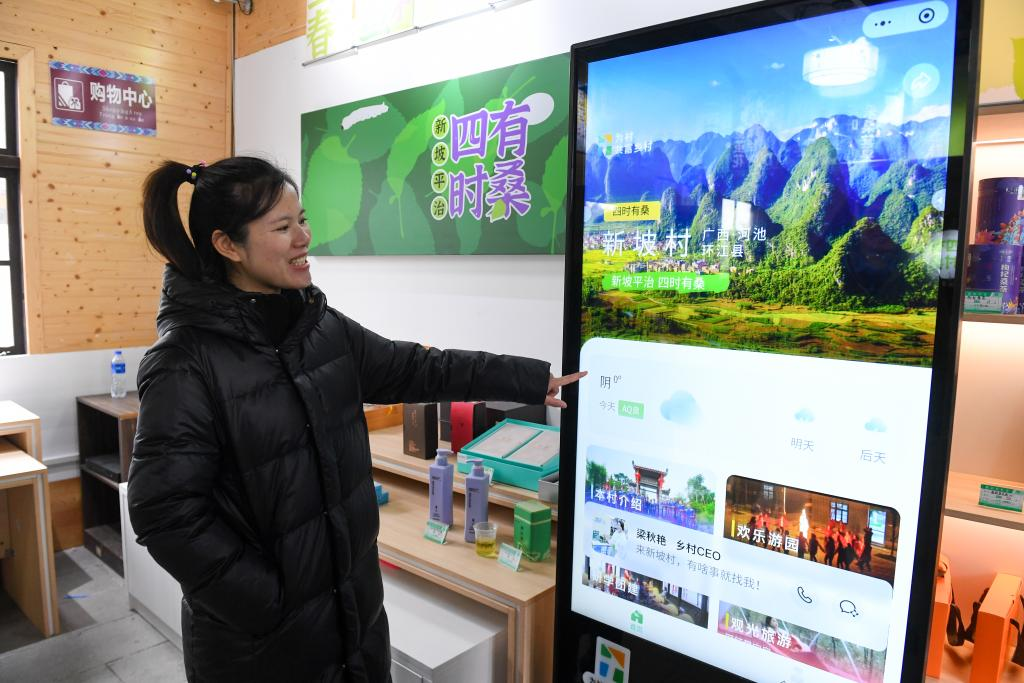 1月26日,在廣西河池市環(huán)江毛南族自治縣大才鄉(xiāng)新坡村的游客中心,“鄉(xiāng)村CEO”梁秋艷介紹粵桂數(shù)字農(nóng)文旅平臺