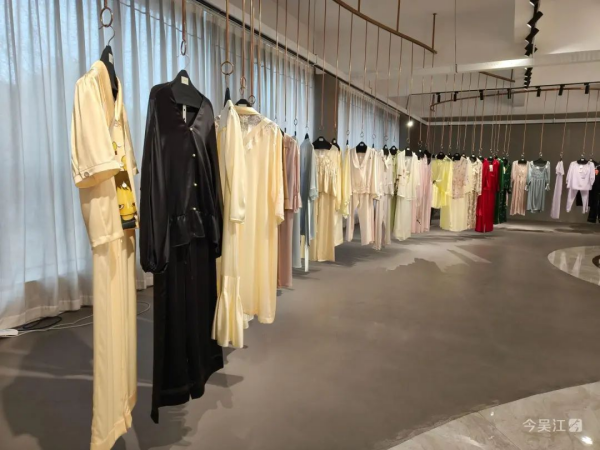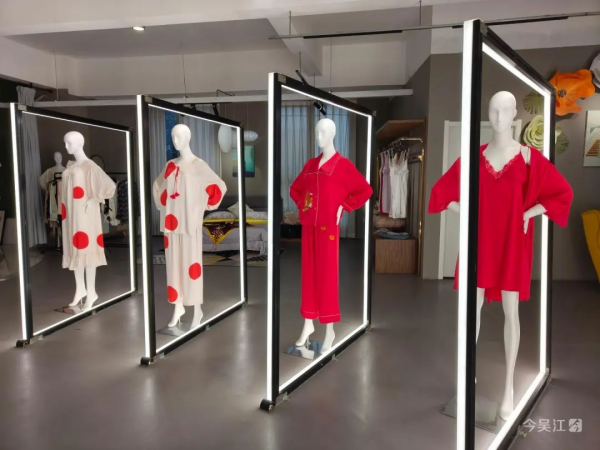 “這是我們最近到法國、意大利參展的一套真絲睡衣,白色的底子上印滿了中國麻將牌的圖案,深受外國客戶的喜愛。龍年到了,我們推出了紅色家居服,上面印上卡通小龍,既喜慶又活潑,在抖音直播間一上架銷售十分火爆。”王春花認為,產(chǎn)品是企業(yè)的生命線,在注重產(chǎn)品品質(zhì)的同時,花形、顏色、款式等方面也要不斷推陳出新,“我們每個季度設計的款式達60個左右,2023年我們正式推出的新產(chǎn)品有120多款,把傳統(tǒng)的原料打造成時尚的服飾,才能打動更多的消費者?!蓖醮夯ㄕf。