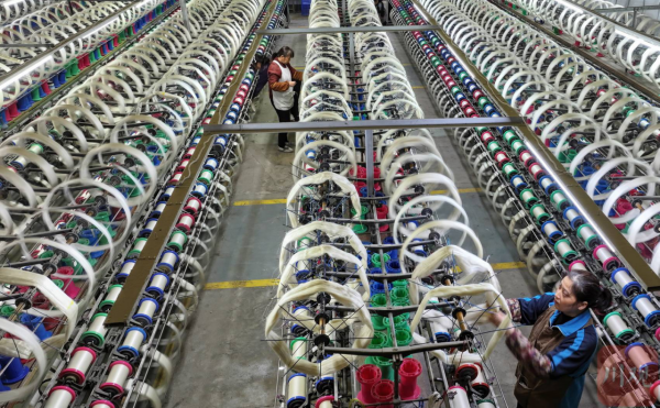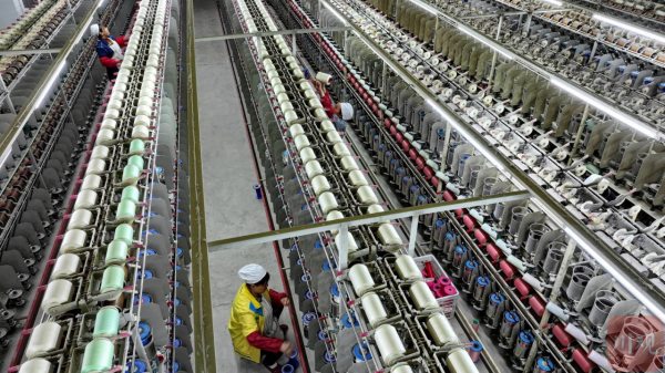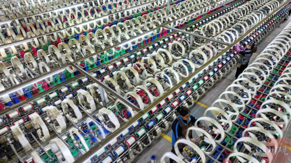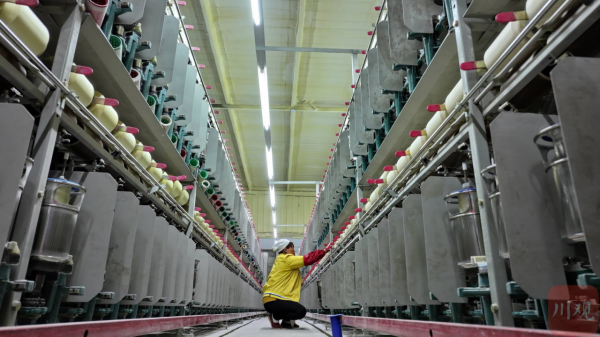 2月21日,在位于四川省南充市嘉陵工業(yè)集中區(qū)的四川順成紡織有限公司紡織車間,工人正在進(jìn)行并攆絲