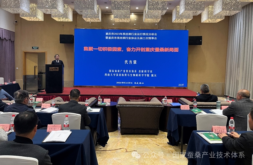 歲序更新,新元肇啟。2024年1月18日,國家蠶桑產(chǎn)業(yè)技術體系首席科學家代方銀教授應邀赴重慶市蠶桑產(chǎn)業(yè)龍頭基地黔江區(qū)參加“重慶市2023年繭絲綢行業(yè)運行情況分析會暨重慶市繭絲綢行業(yè)協(xié)會五屆二次理事會”并作培訓報告。他以“集聚一切積極因素,奮力開創(chuàng)重慶蠶桑新局面”為題,從“鑒史知責,立志振興”“抓住機遇,找準定位”“發(fā)揮優(yōu)勢,全面發(fā)力”“補鏈強鏈,后來居上”四個方面展開,剖析了重慶市蠶桑絲綢產(chǎn)業(yè)在新時代“大蠶?!比种械陌l(fā)展定位和機遇,勉勵重慶市蠶桑絲綢行業(yè)同仁不忘初心使命,檢視短板弱項,發(fā)展新質(zhì)生產(chǎn)力,弘揚“絲路精神”,發(fā)揚“干”字精神,團結奮斗,奮力開創(chuàng)重慶蠶桑新局。