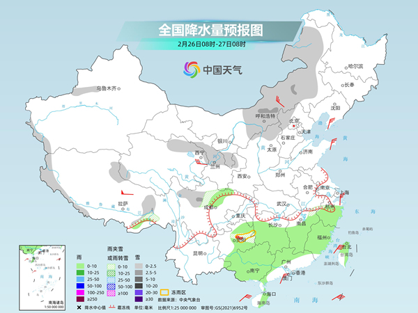今明天(2月26日至27日),南方大范圍陰雨天氣持續(xù),多以小雨為主;北方的華北、東北等地部分地區(qū)先后有降雪。后天開始至3月1日,我國中東部又將有大范圍雨雪天氣,南方大部近期降水頻繁,公眾春運出行請注意防范。氣溫方面,今天至3月1日,我國大部地區(qū)氣溫仍較常年同期偏低,江南等地部分地區(qū)偏低7℃左右,濕冷感較重。