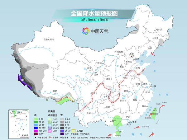 根據(jù)中央氣象臺(tái)預(yù)報(bào),今天,新疆南疆西部山區(qū)、西藏西部等地部分地區(qū)有中到大雪,其中,新疆南疆盆地、西藏西部等地部分地區(qū)有暴雪,西藏西部局地有大暴雪或特大暴雪(30~45毫米)。西南地區(qū)東部、江南東部、華南中東部、臺(tái)灣島等地部分地區(qū)有小到中雨。