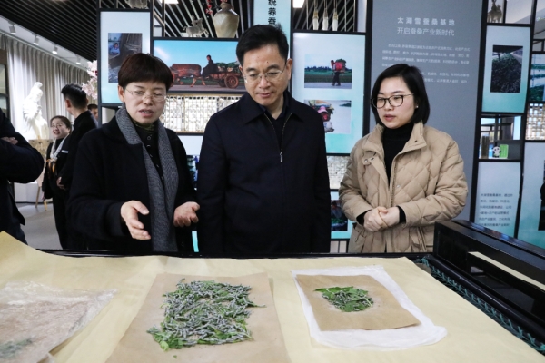 在太湖雪蠶桑文化園,許益軍一行參觀了科普長廊、育蠶課堂、繭藝工坊等,聽取震澤鎮(zhèn)源遠(yuǎn)流長的蠶桑絲綢文化介紹,實(shí)地感受剝繭抽絲、拉綿制被等傳統(tǒng)工藝。太湖雪蠶桑文化園是中國首個(gè)以蠶桑為主題,集農(nóng)業(yè)示范、蠶??蒲小⑽幕蓍e、科普展示、生態(tài)旅游為一體的特色生態(tài)園,通過4000平方米展示館、2000畝桑園、2000畝果園、2000畝稻田再現(xiàn)江南魚米之鄉(xiāng)、絲綢之府。