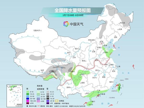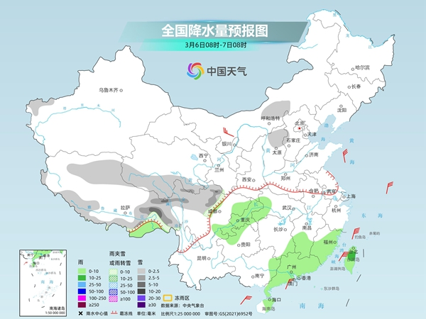 隨著冷空氣繼續(xù)向南推進(jìn),今天(3月6日),北方的雨雪將大幅縮減,南方的陰雨范圍也將有所收斂。明天,中東部此輪雨雪過程將趨于結(jié)束。不過緊接著,8日至10日,長江以南地區(qū)新一輪陰雨天氣將自西向東發(fā)展起來。氣溫方面,今天,降溫的重心將轉(zhuǎn)移至江南、華南一帶,尤其是華南地區(qū),氣溫普遍沖高回落,前后冷暖反差較大。