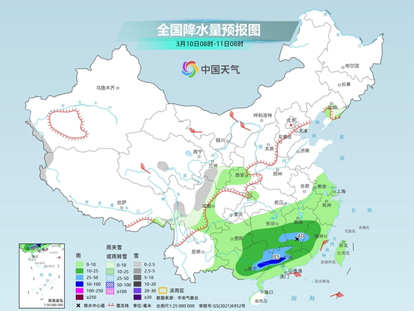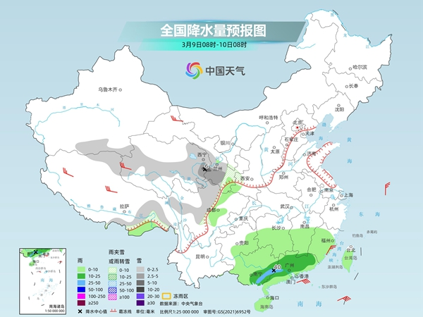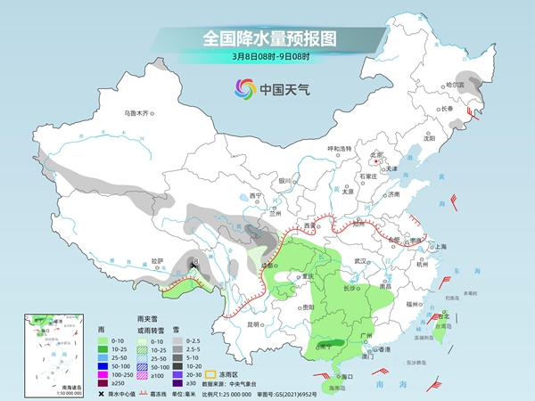 明天,西藏東南部、青海中東部、甘肅南部、川西高原中北部等地部分地區(qū)有小到中雪或雨夾雪,其中,青海東部等地局地有大雪。四川盆地西部、貴州東南部、湖南中南部、江西中南部、華南大部等地部分地區(qū)有小到中雨,其中,廣西東南部、廣東西部等地部分地區(qū)有大雨。