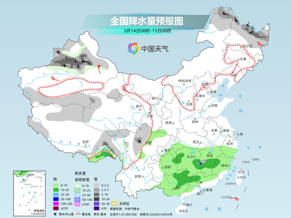 明天,內(nèi)蒙古東北部、黑龍江中北部、新疆北疆西部、沿天山地區(qū)和南疆盆地南部、西藏東部、青海西部、川西高原北部等地部分地區(qū)有小到中雪或雨夾雪,其中,黑龍江北部、新疆沿天山地區(qū)和伊犁河谷、川西高原北部等地部分地區(qū)有大雪,局地暴雪(10~15毫米)。四川盆地西部、重慶東部、貴州中東部、湖北南部、湖南、江西、浙江中南部、福建中西部、廣西大部、廣東中北部等地部分地區(qū)有小到中雨,其中,湖南東部、江西西部等地部分地區(qū)有大雨(25~30毫米)。