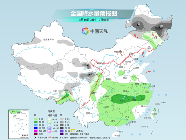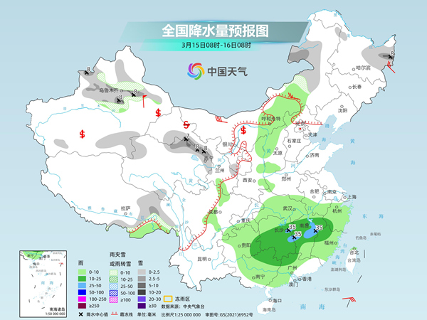 明天,內(nèi)蒙古中東部、黑龍江東北部、新疆沿天山地區(qū)、西藏南部和東部、青海北部、甘肅河西、寧夏南部等地部分地區(qū)有小到中雪或雨夾雪,其中,黑龍江東北部、新疆沿天山地區(qū)、青海北部和東部等地部分地區(qū)有大雪(5~8毫米)。陜西北部、山西北部、江漢大部、江南、華南大部等地部分地區(qū)有小到中雨,其中,湖南東部、江西中北部等地部分地區(qū)有大雨(25~35毫米)。